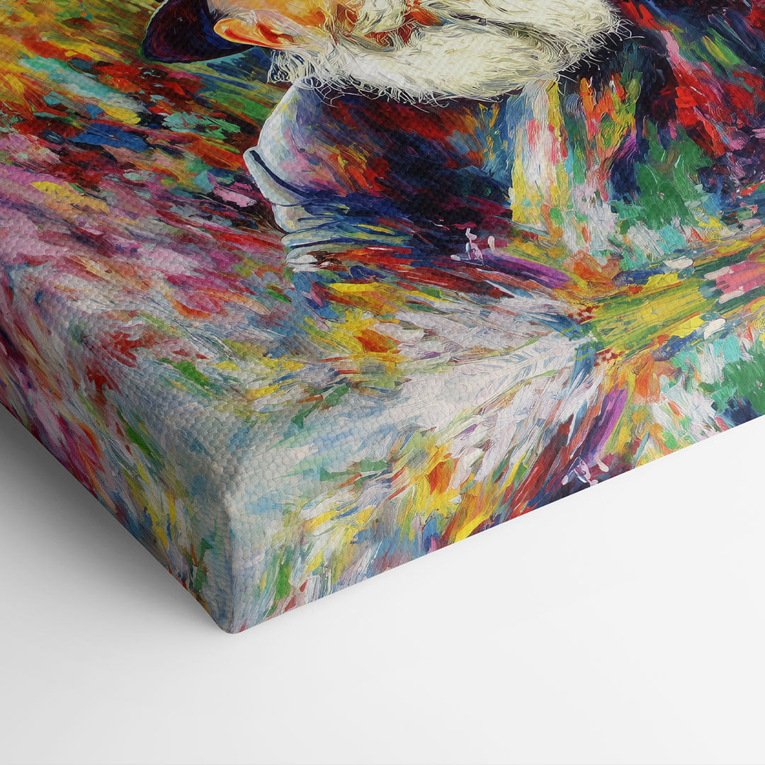 A vibrant canvas print of the Lubavitcher Rebbe (Rabbi Menachem Mendel Schneerson) waving his arm, By Shmueli Bell in a colorful impressionistic style.